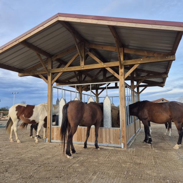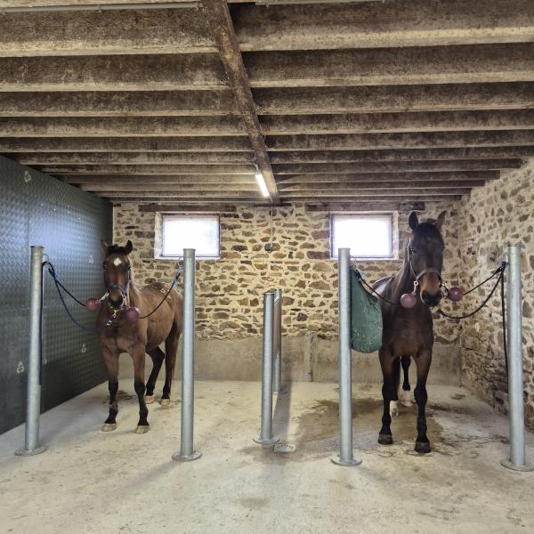 Les chevaux évoluent entre les prairies et une surface d'écurie active ;